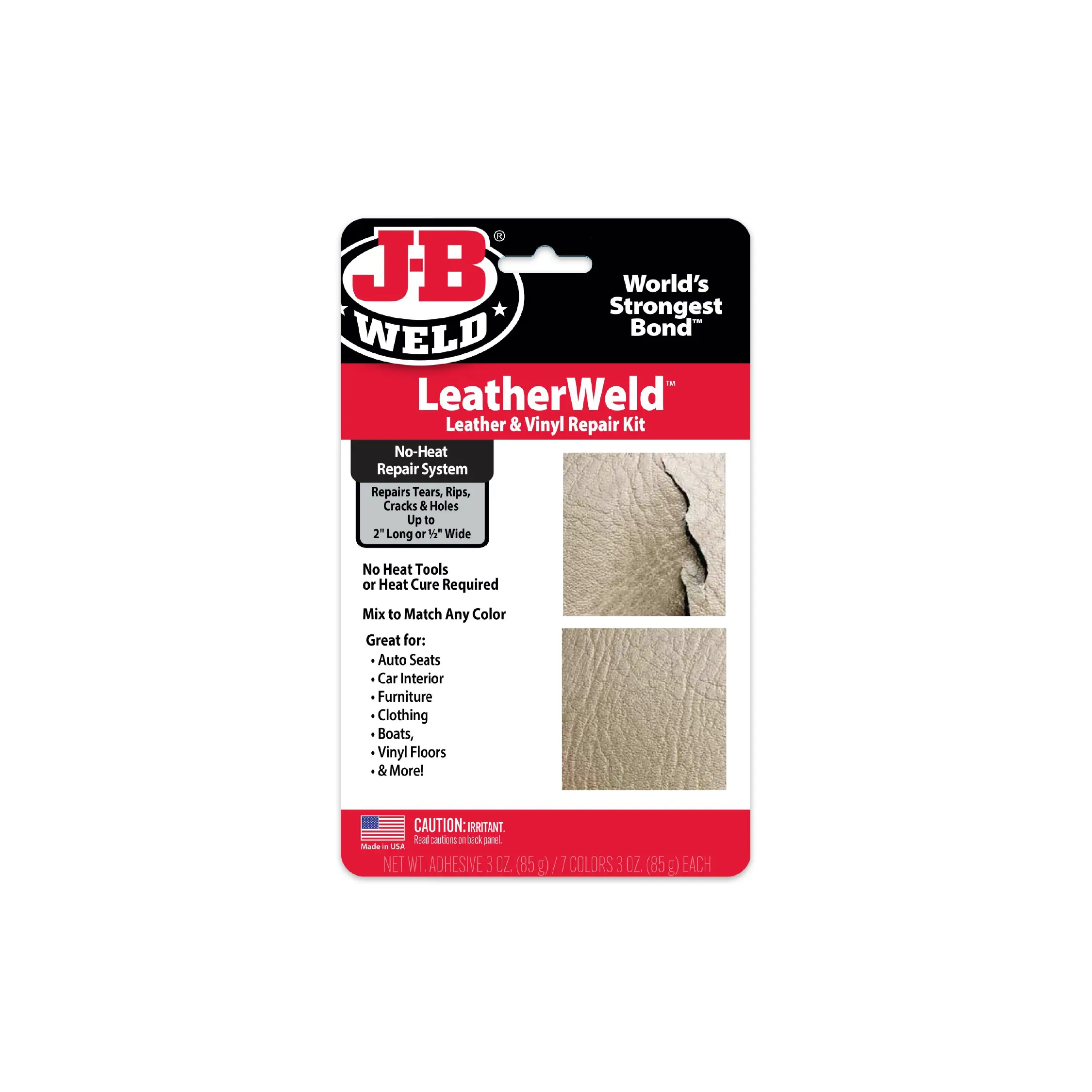El kit de reparación de vinilo y cuero J-B es un kit profesional con plancha eléctrica enchufable para realizar reparaciones de estilo profesional. Contiene 3 oz. de pasta adhesiva para reparación de cuero, respaldo de tela, aplicador e instrucciones.
