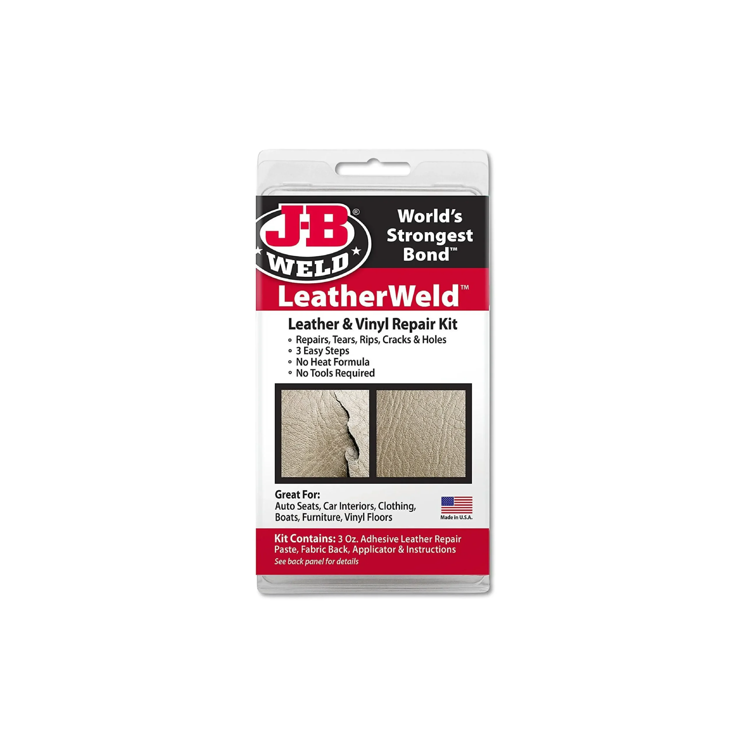 - El kit contiene 3 oz de pasta adhesiva para reparación de cuero, respaldo de tela, aplicador e instrucciones
