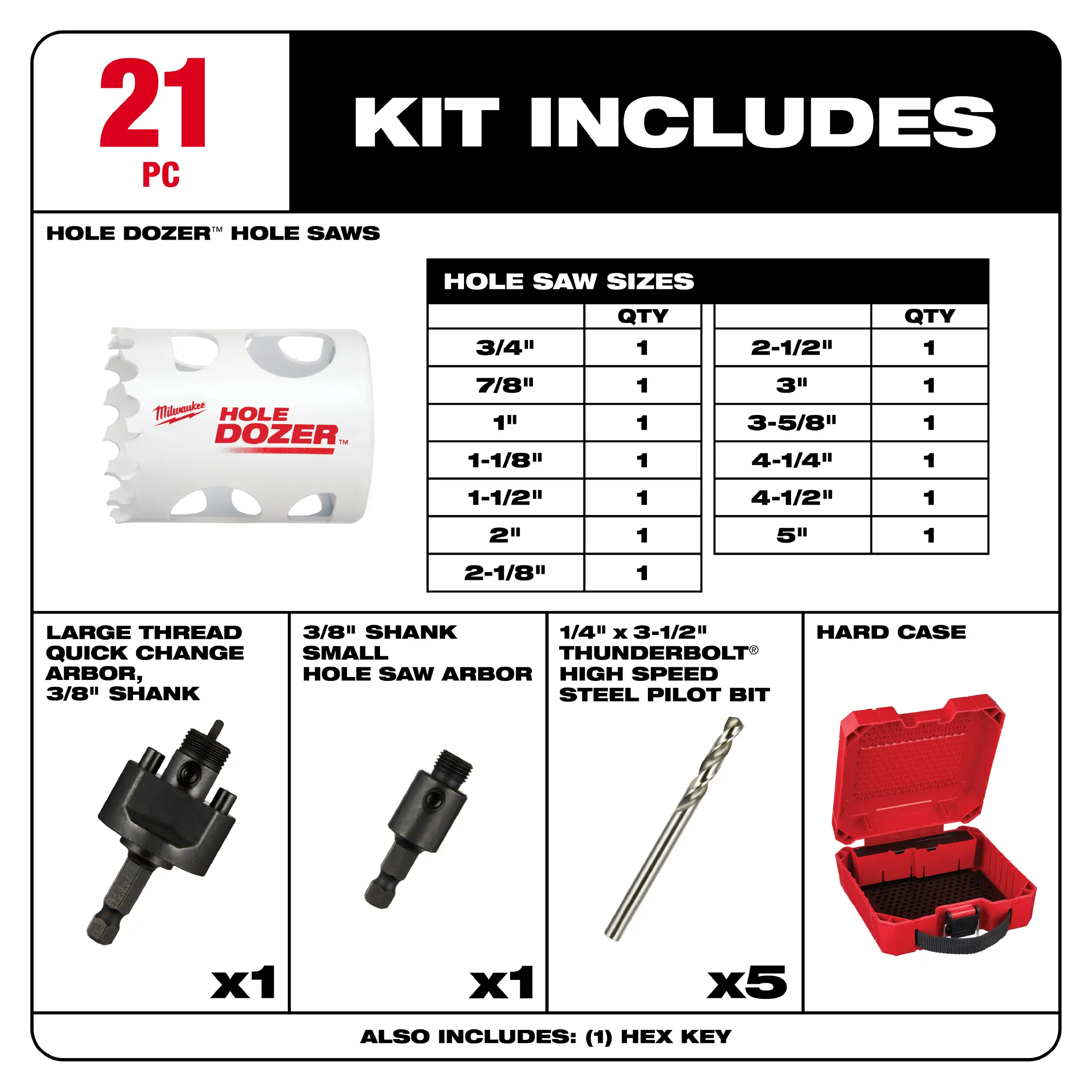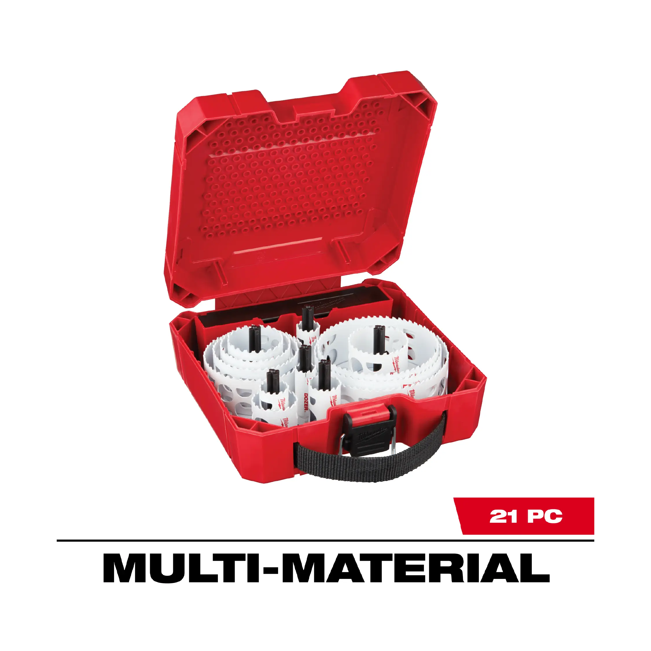 Nuestro kit de sierras de corona de uso general HOLE DOZER de 21 piezas presenta un nuevo diseño de dientes de 3,5 TPI que le ofrece la mayor vida útil en aplicaciones de metal. Estas sierras de corona bimetálicas HOLE DOZER de MILWAUKEE cuentan con la única garantía de por vida contra rotura de dientes del sector y son aptas para todo tipo de aplicaciones de uso general, lo que las convierte en las sierras de corona más duraderas. Nuestras ranuras de acceso total eliminan la frustración de tener que retirar el tapón, lo que le permite ser más productivo y reducir el tiempo de inactividad entre orificios. El nuevo diseño de las ranuras también le brinda mayor visibilidad del piloto para una colocación precisa y una expulsión más rápida de la viruta, manteniendo el corte frío. El revestimiento termoestable HOLE DOZER permite un corte más rápido y está optimizado para herramientas inalámbricas, lo que le permite realizar un 25 % más de orificios por carga. Nuestras sierras de corona bimetálicas HOLE DOZER se fabrican con orgullo en EE. UU. Este kit de sierra de corona también incluye un estuche, que le ofrece una mayor capacidad de personalización gracias a las clavijas intercambiables. Puede guardar mandriles, brocas piloto y más en la caja de accesorios extraíble o retirarla por completo para tener más espacio para las sierras de corona. Cada estuche para sierras de corona Milwaukee cuenta con una rejilla reforzada en la parte superior e inferior, además de cierres resistentes que permiten guardar las sierras de corona de forma segura en este resistente y rígido estuche.