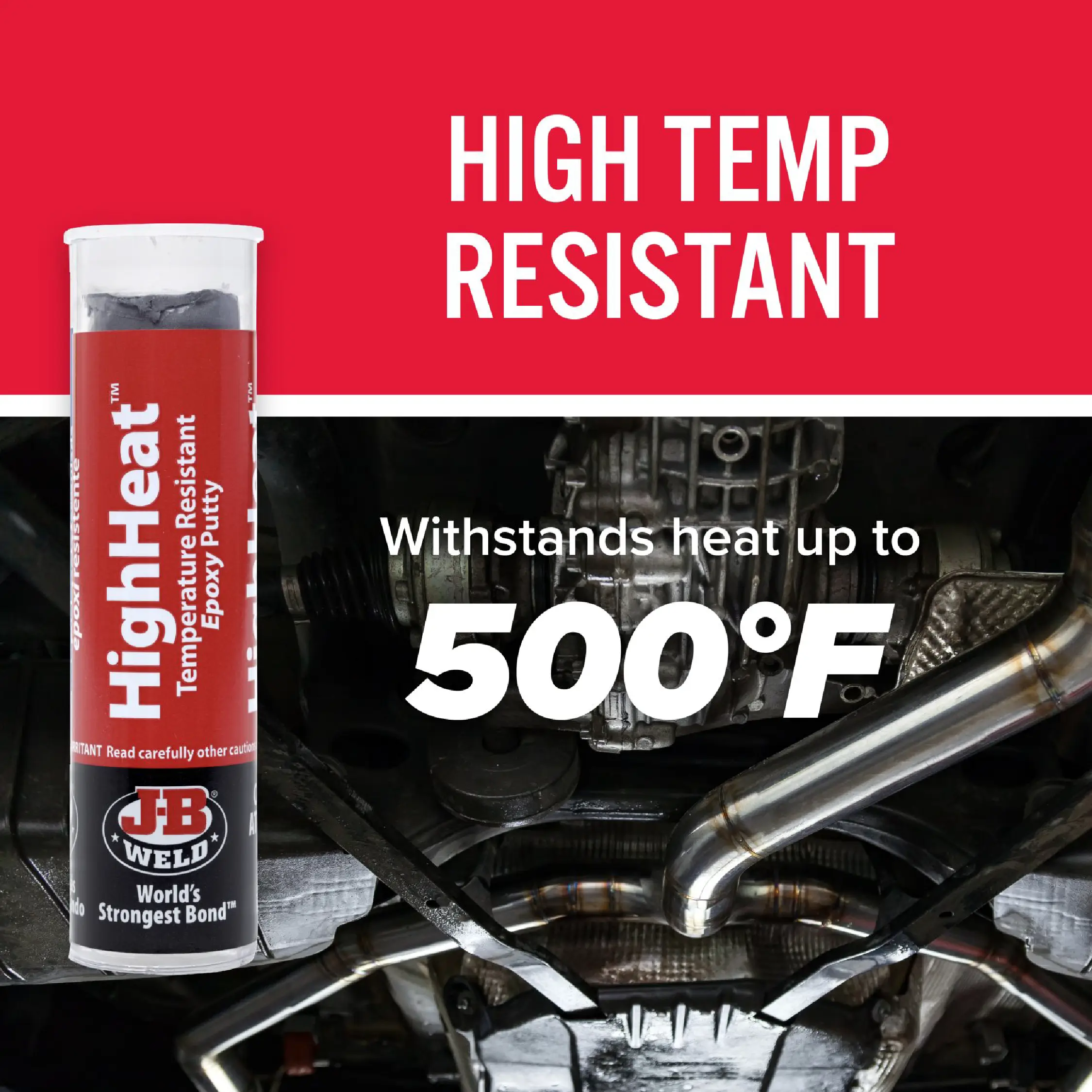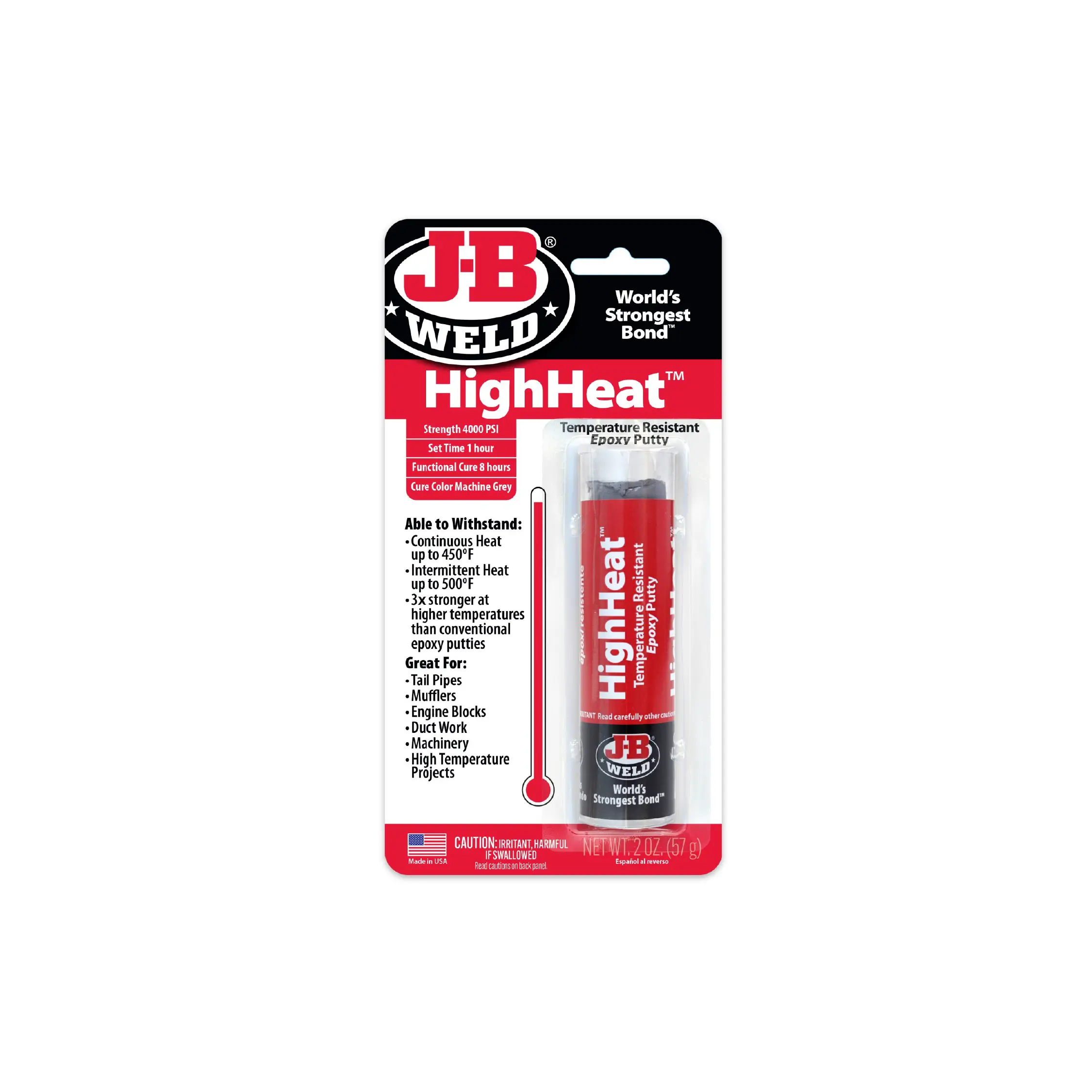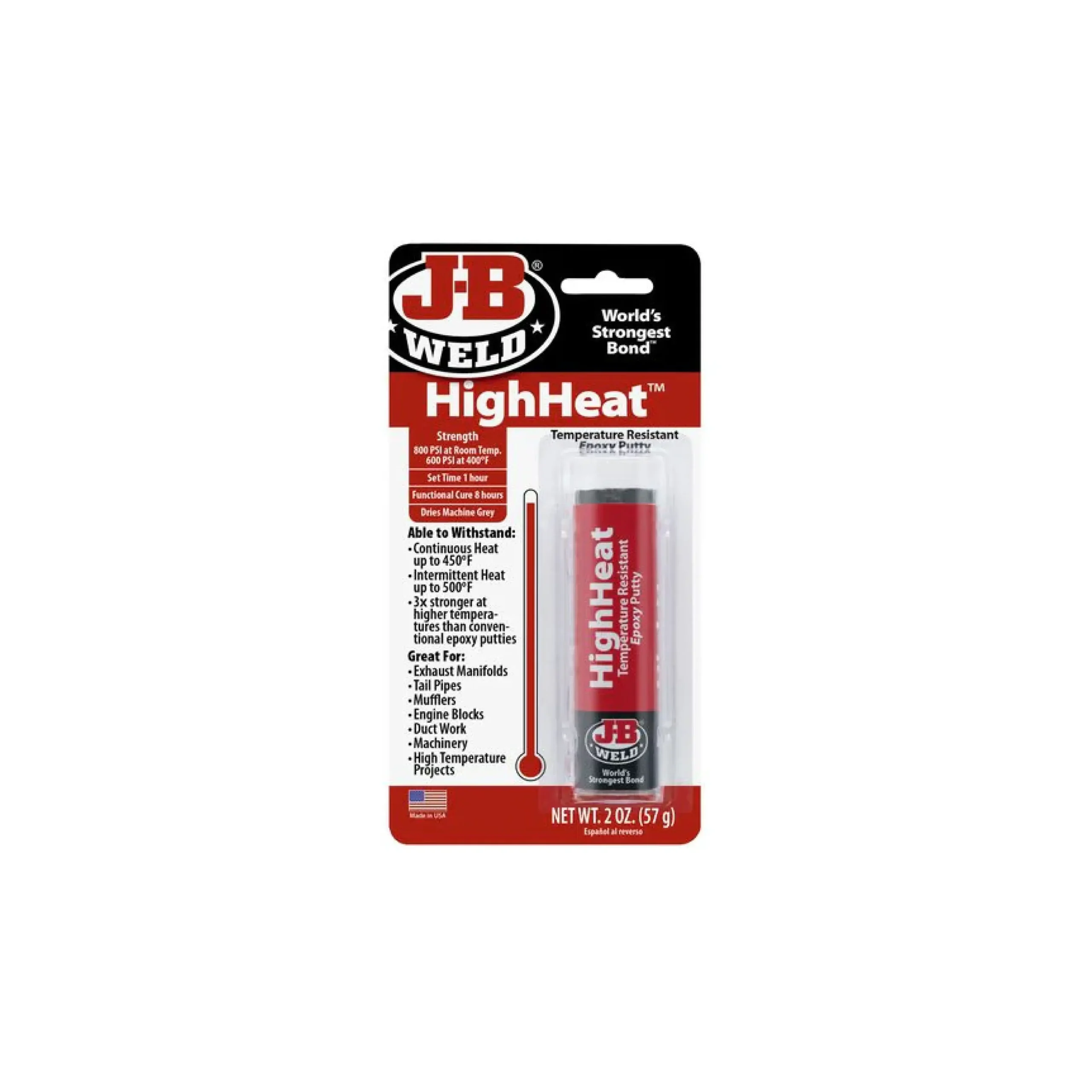 La masilla epoxi de alta temperatura de J-B Weld puede soportar calor continuo de hasta 232 °C (450 °F) y calor intermitente de hasta 260 °C (500 °F). Ofrece una resistencia de 800 PSI a temperatura ambiente y de 600 PSI a 204 °C (400 °F). Es perfecta para tubos de escape, silenciadores, maquinaria, bloques de motor y colectores de escape. Esta masilla epoxi es 3 veces más resistente a altas temperaturas que las masillas epoxi convencionales. Fragua en 1 hora, cura en 8 horas y seca con un color gris metalizado.