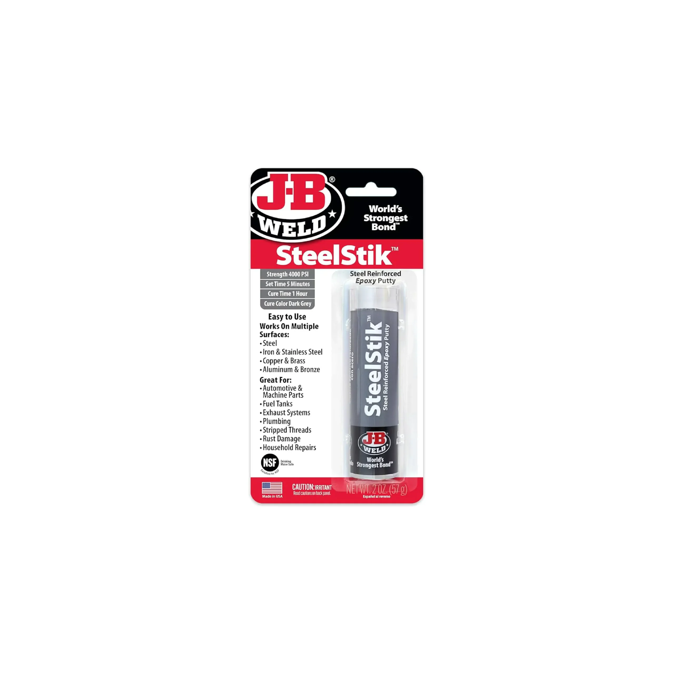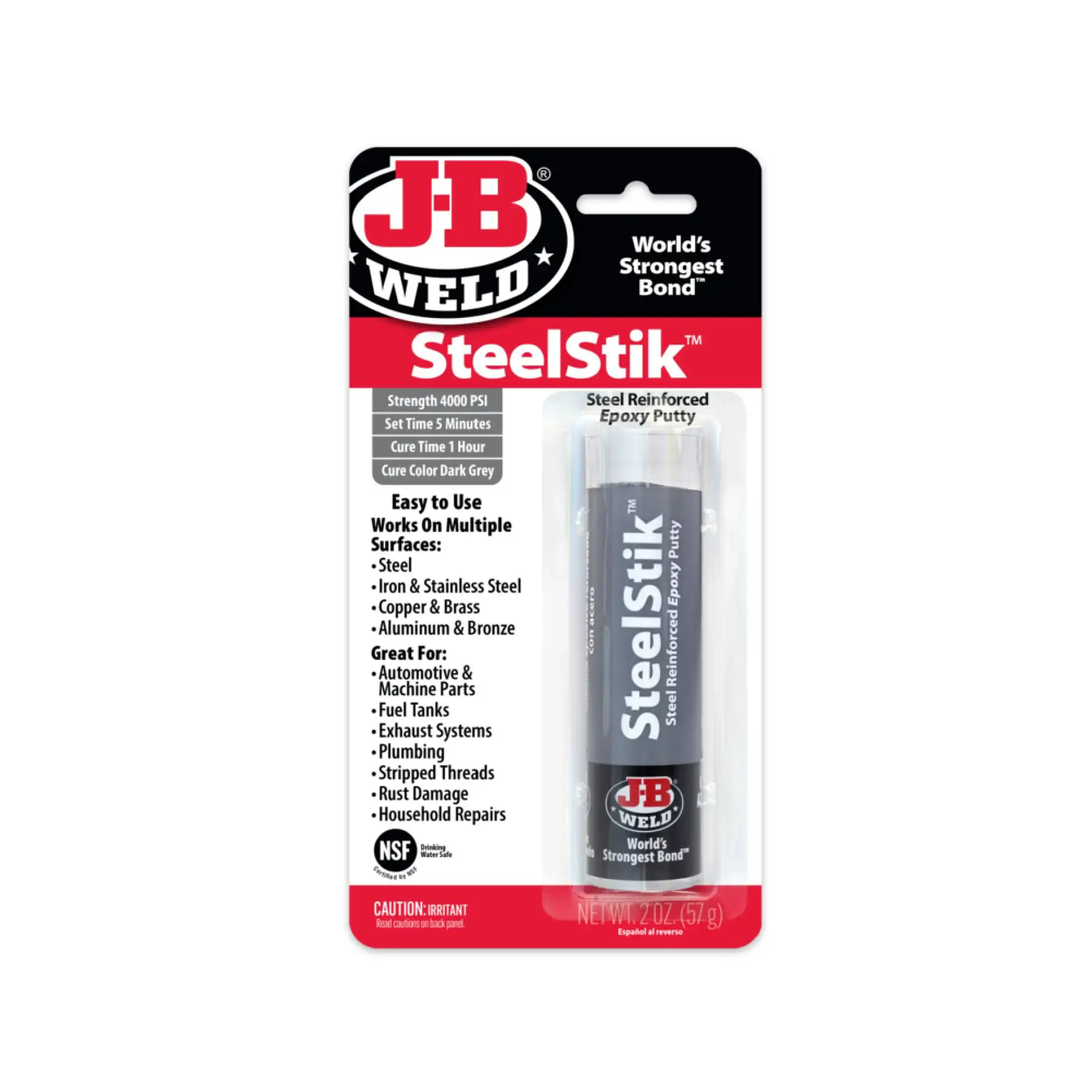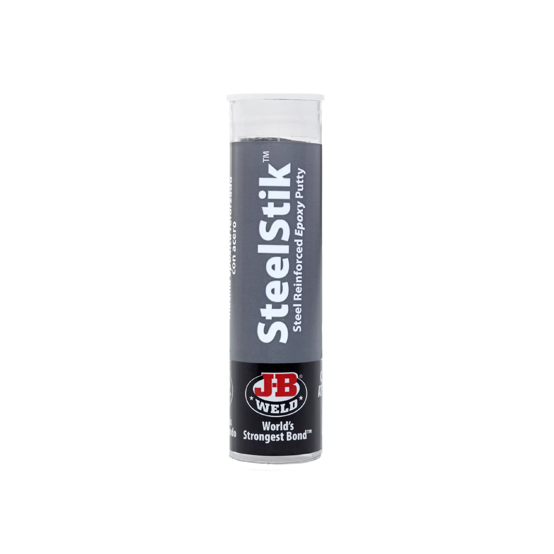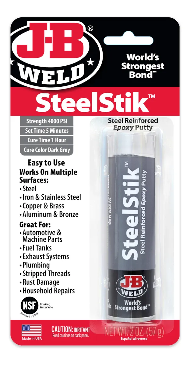 J-B Weld es una masilla epoxi adhesiva/selladora reforzada con acero, amasable a mano, que tapará agujeros y realizará reparaciones permanentes en superficies húmedas y secas. ¡Incluso curará completamente sumergida en agua o gasolina! Simplemente amasa a fondo, con los dedos, la porción necesaria para la reparación y aplícala. J-B Stik curará completamente en 20-30 minutos y se puede taladrar, lijar, limar, roscar, mecanizar y pintar.